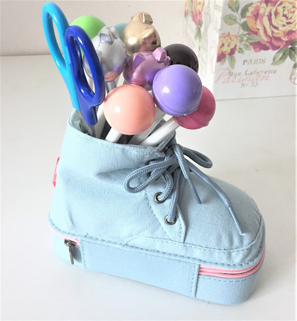 Next is this shoe-shaped pencil case. It is available in various colours like dark blue, green, pink, grey, purple, yellow, brown etc, but you can choose yours. I picked this soft blue and pink pencil case. It is also surprisingly light.